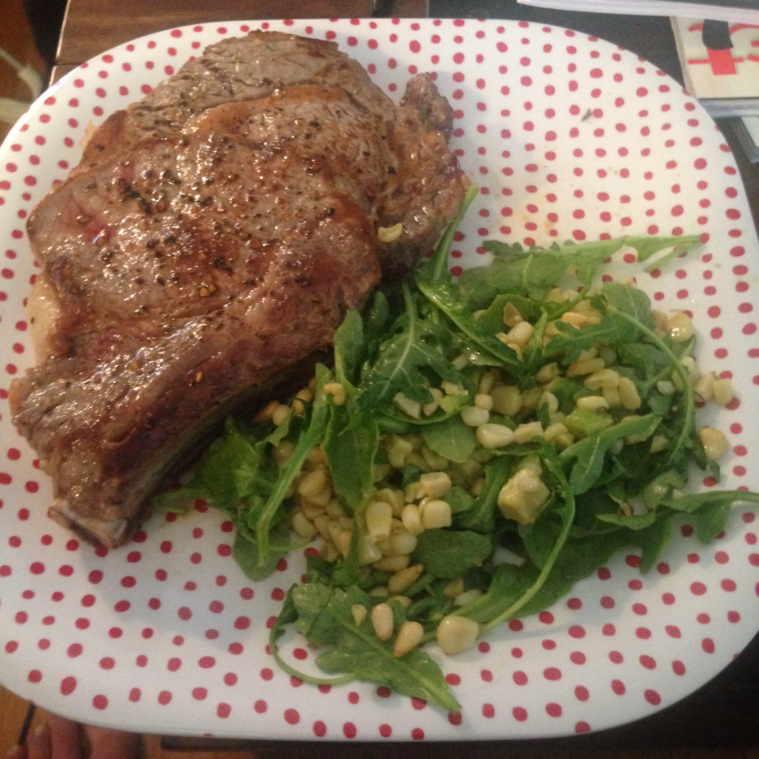 I had some corn, some arugula, an avocado and 2 bone-in rib eyes (from Whole Foods) sitting in the fridge begging for some love, so I broke out the skillet and got to work.